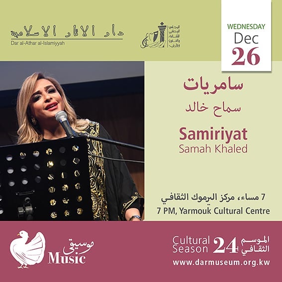 A traditional Khaliji night entitled “Samiriyat” performed by the Vocalist Samah Khaled. “Samri” is a folkloric music and dance native to Najd and common as a musical style in Khaliji music. It involves singing poetry while the daff drum is being played often while two rows of men, seated on the knees, sway and clap to the rhythm.