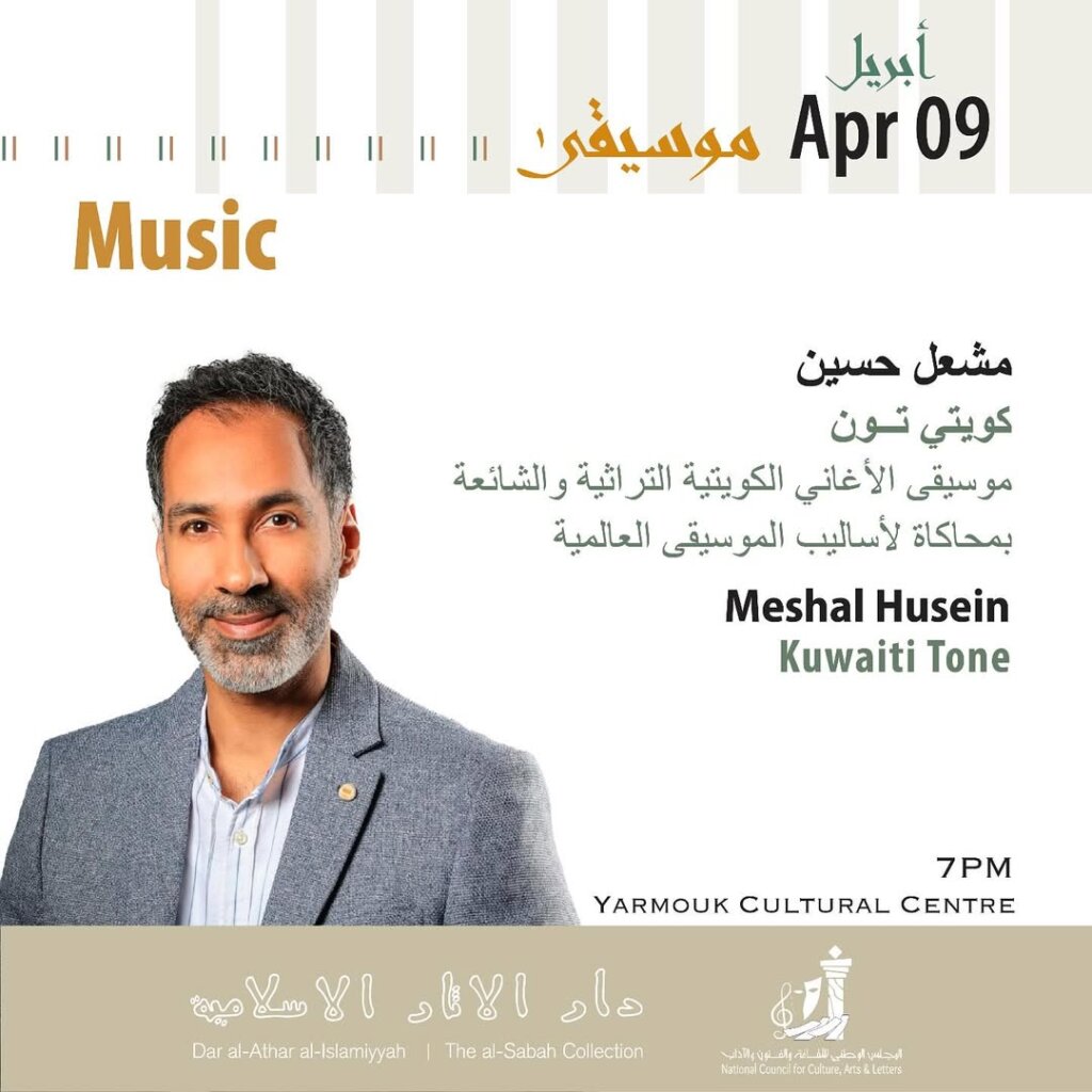 Tonight’s music night, “Kuwaiti Tone”, performed by Meshal Husein at the Yarmouk Cultural Centre.