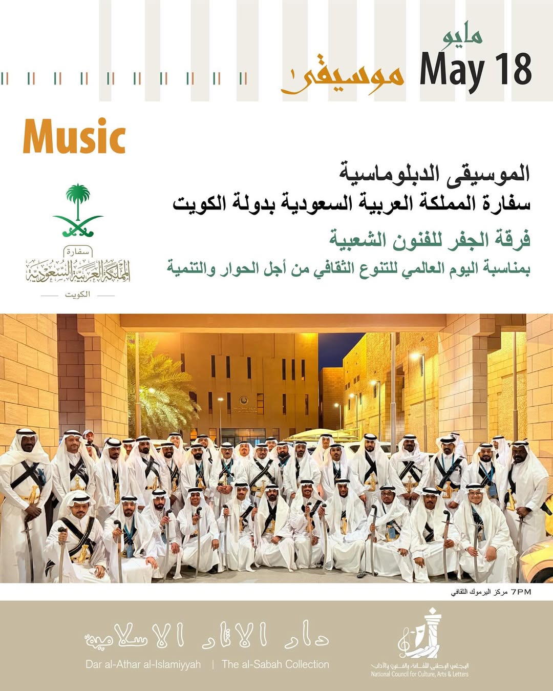Al-Jafr Folklore Band performed a special music night today at the Yarmouk Cultural Centre on the occasion of the World Day for Cultural Diversity for Dialogue and Development. The evening was held in cooperation with the Embassy of the Kingdom of Saudi Arabia in the State of Kuwait.